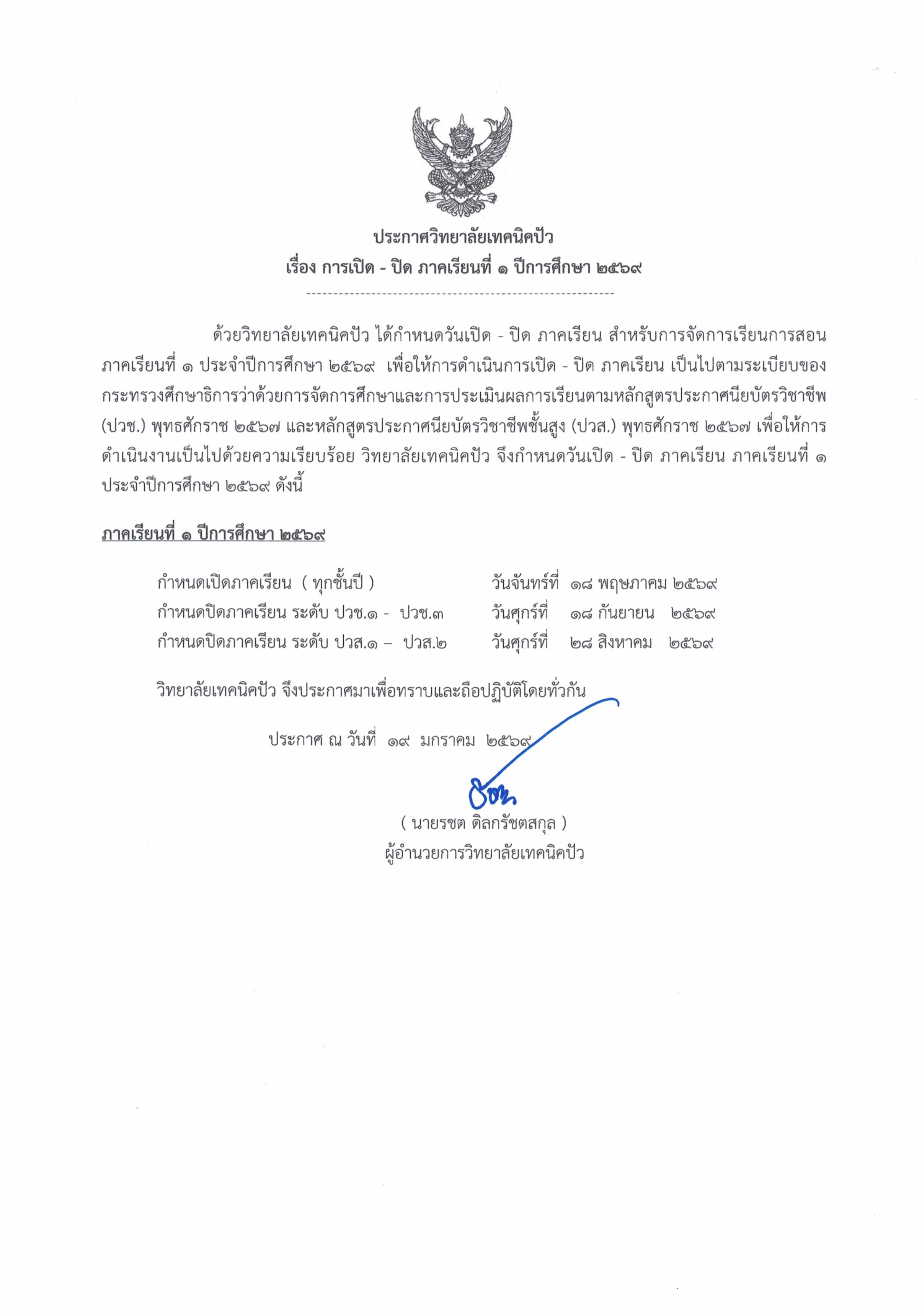 เรื่อง การเปิด - ปิด ภาคเรียนที่ 1 ปีการศึกษา 2569
